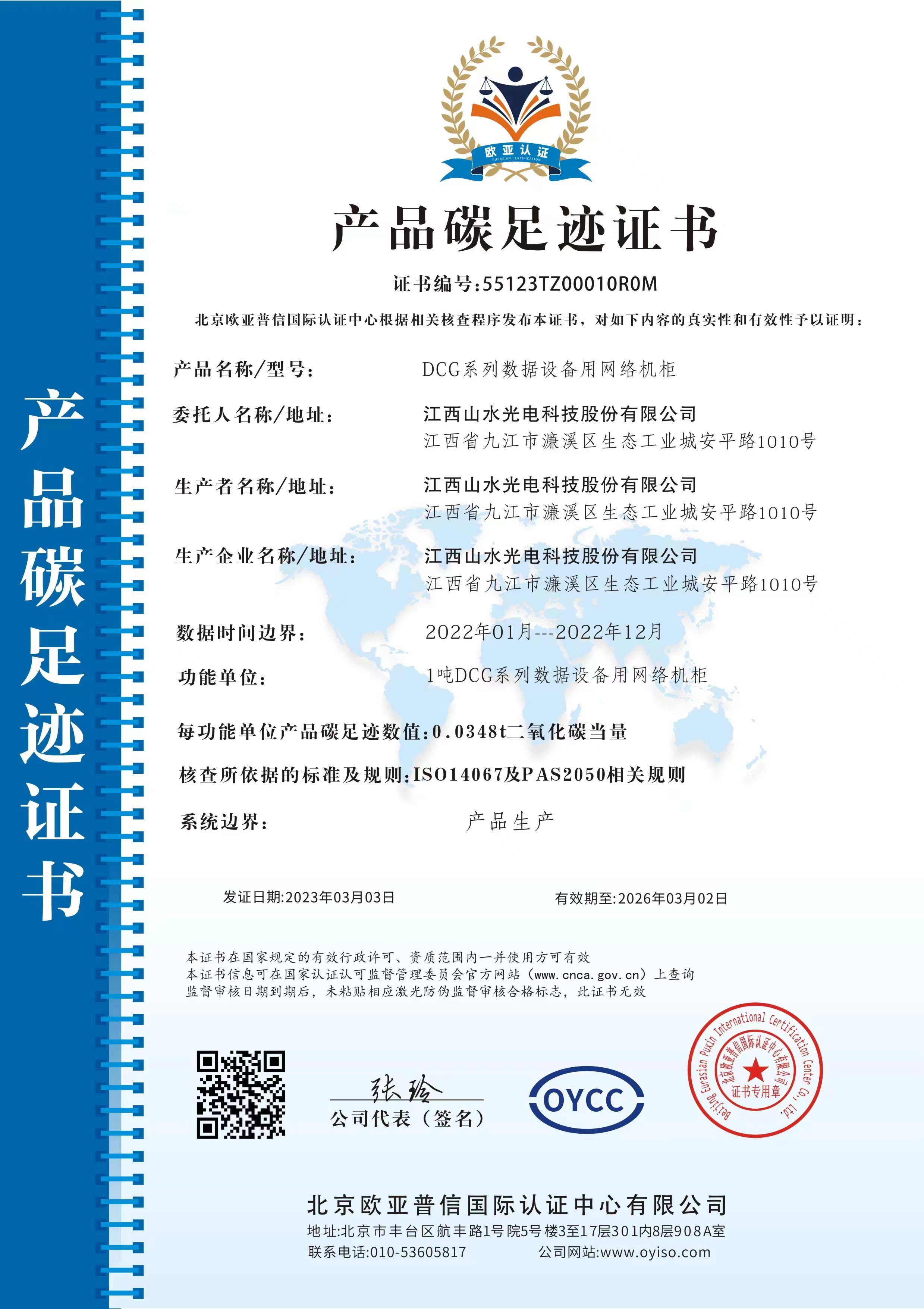 江西山水光电科技股份有限公司2022年度网络机柜碳足迹已通过北京欧亚普信国际认证中心核查并认证,相关证书见附件。